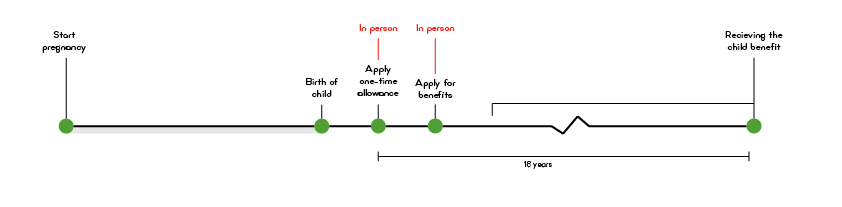 In the old situation there were two different processes, the birth application process at the local municipality and applying for child benefits at the Social Security Bank of the Netherlands. The registration process can often only be done offline, while applying for child benefits is mostly done online.