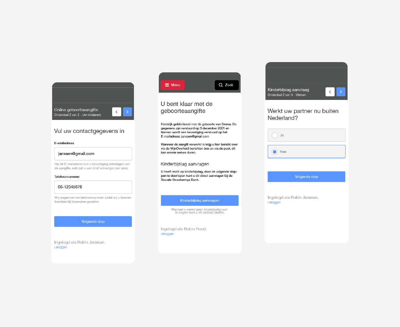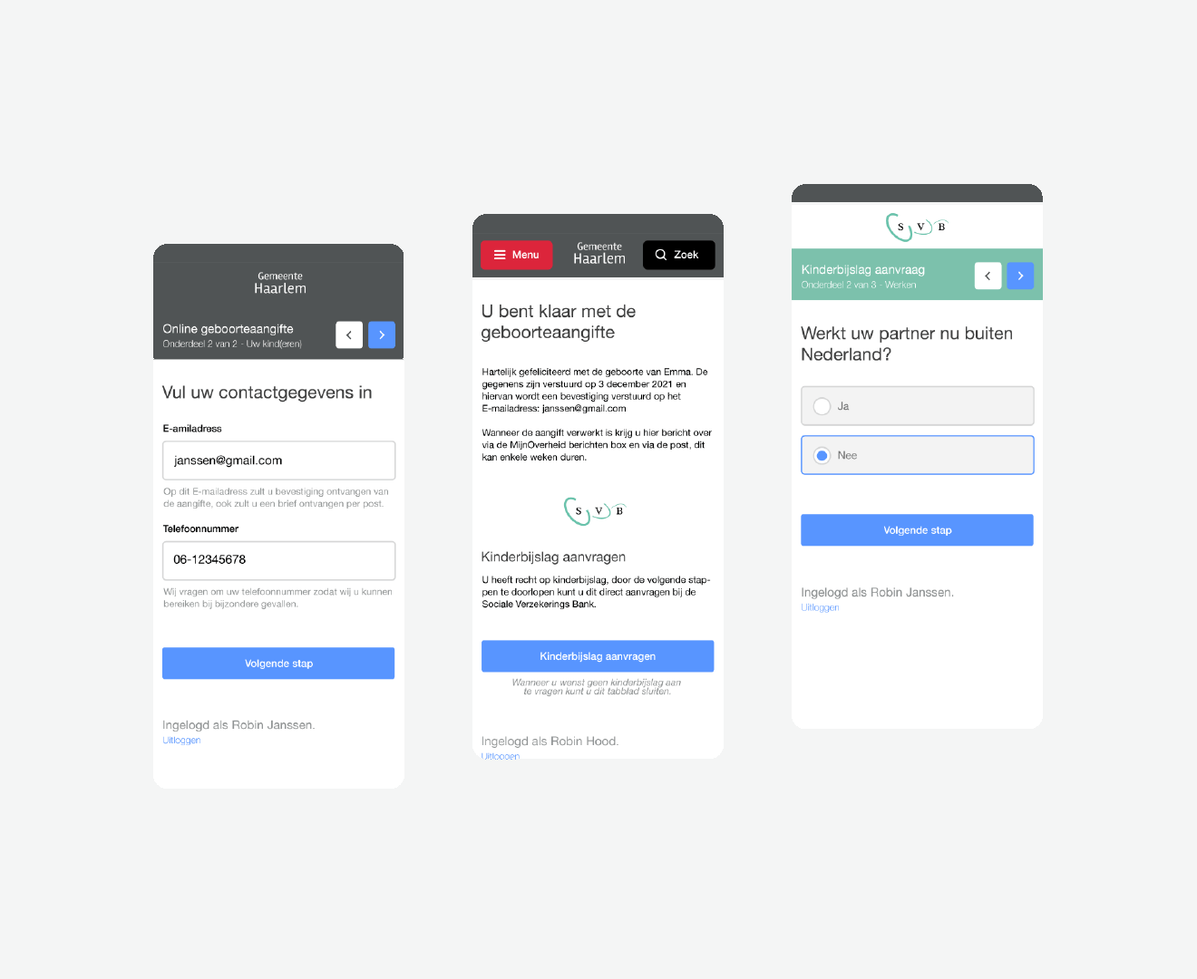 When the wireframe version was approved the screens were developed into a high-fidelity design. The purpose of this high-fidelity is to conduct user research, therefore we skipped straight to a high level of detail. We were able to do so as both the municipality of Haarlem and the Social Security Bank have a clear design system to follow.